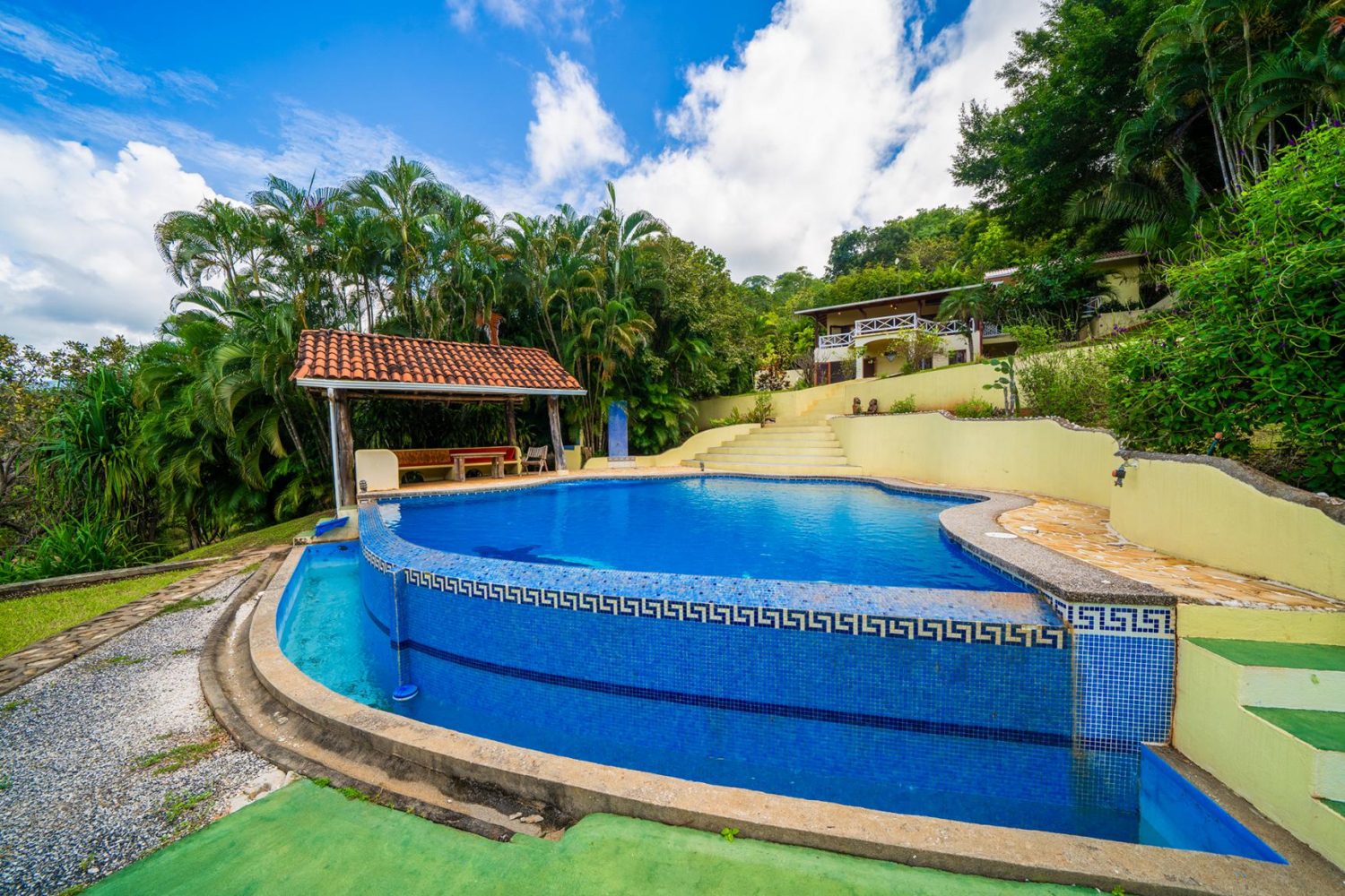 A beautifully designed path leads through the lush garden down to the pool area, which is perfect for relaxation and entertainment. The pool area features an outdoor shower, a rancho, and plenty of space for lounge chairs. Beyond the pool, a dedicated area is set aside for growing ….., adding a charming, agricultural touch to the property.
