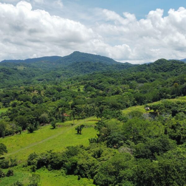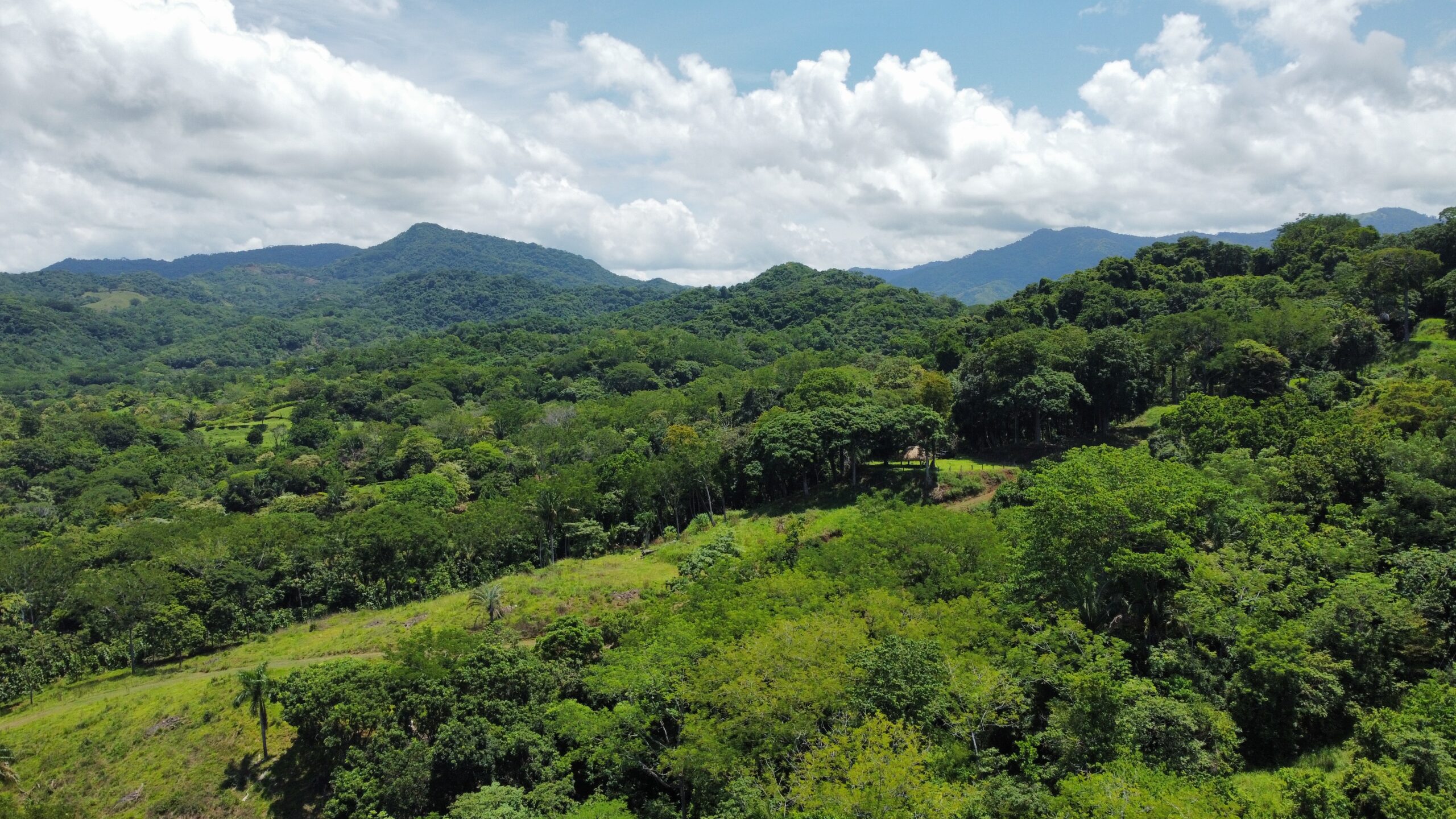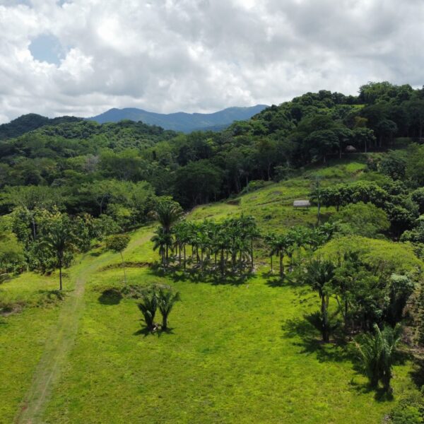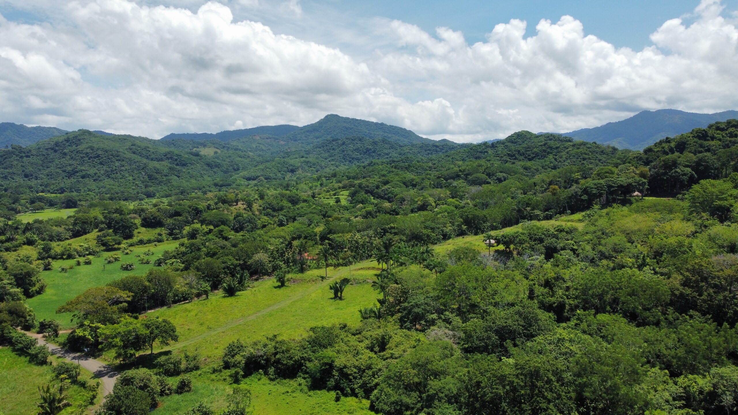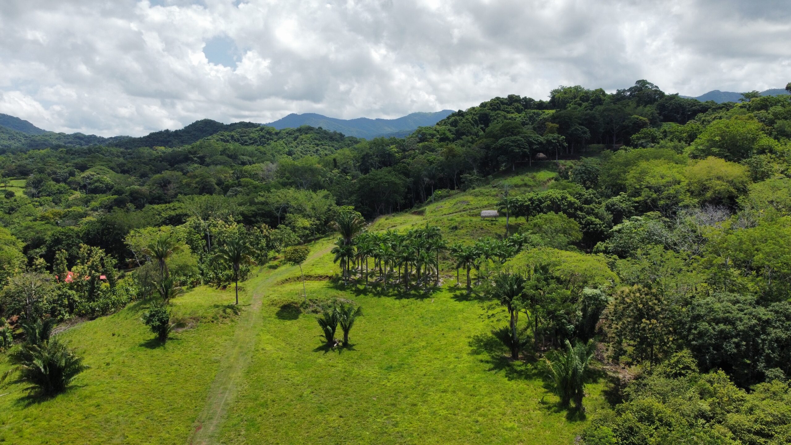 The land is characterized by gently rolling hills, creating a dynamic yet highly usable landscape. The majority is open pasture, making construction straightforward, while scattered giant trees provide shade and a sense of scale and character. A smaller section of forest adds biodiversity and a natural touch to the setting.